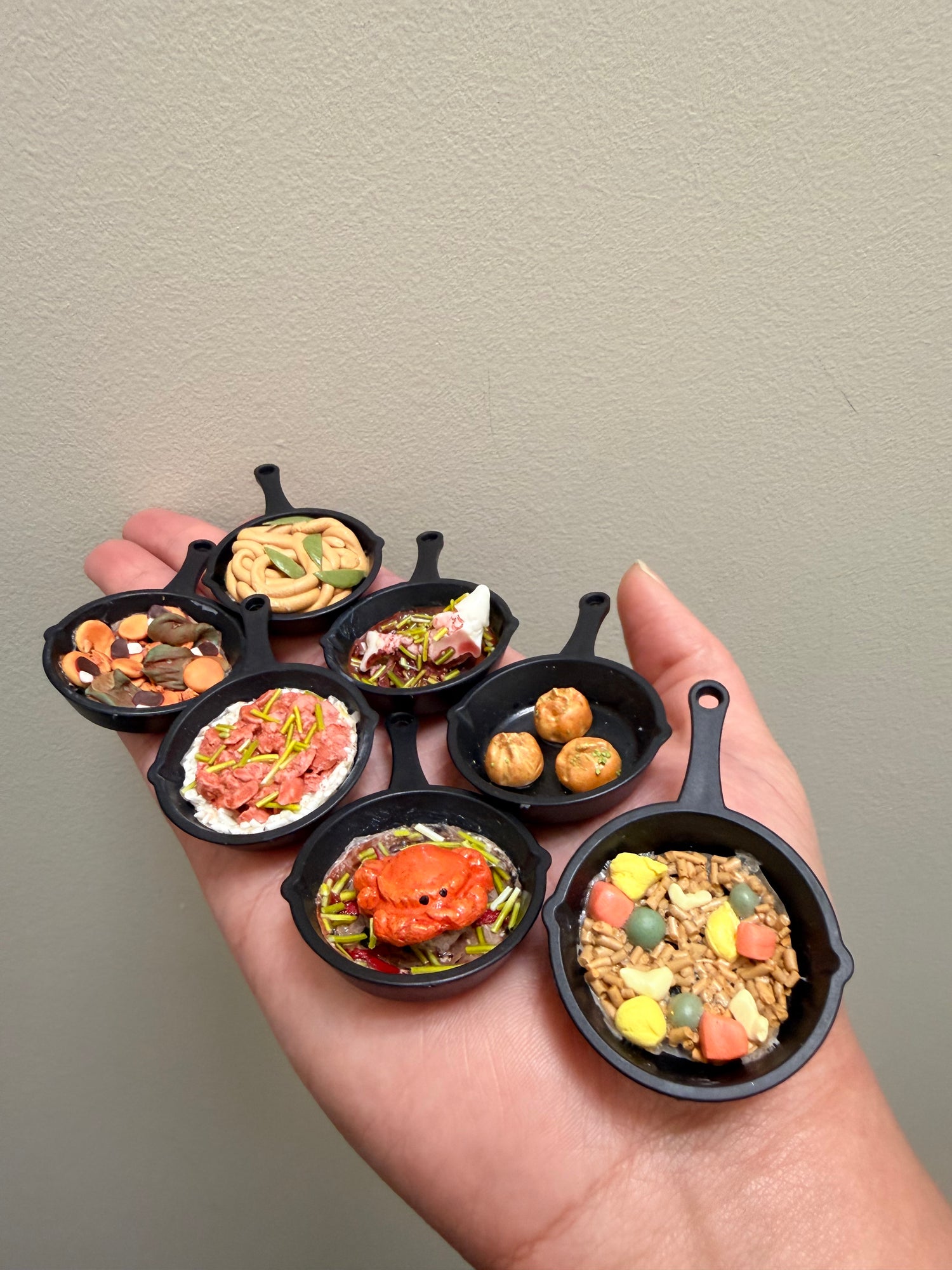 These tasty looking skillet charms are very versatile with their options. You have the option to make them into a keychain or a magnet. For a keychain, you can pick up the color and shape you would like. All skillet charms are made by hand and coated with water resistant clear sealant.
